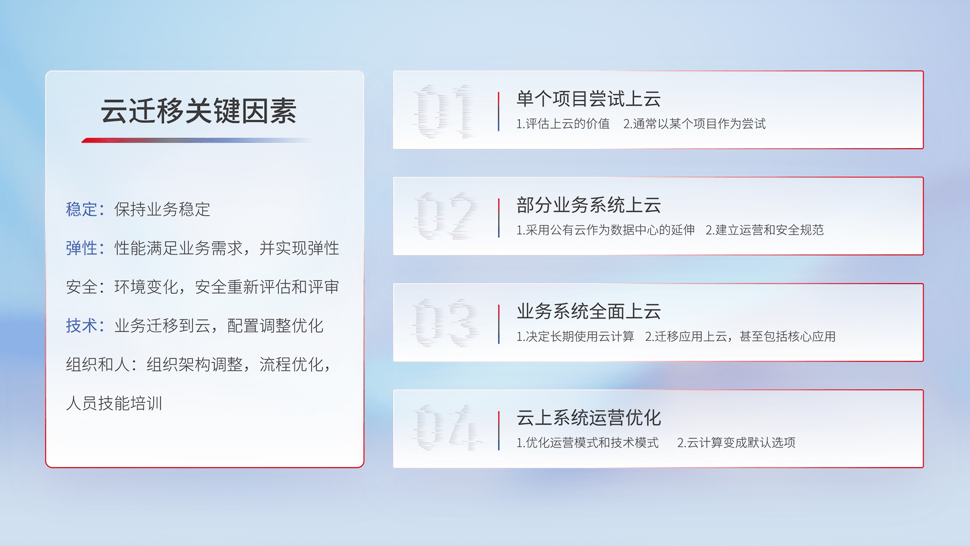 结合实际业务,,,,从规划设计、、、、云平台选型、、、云原生改造、、、、数据迁移、、集成交付,,,,迁移全过程为客户识别最佳上云路径,,,,做好风险识别管理,,设计网络架构、、、身份权限、、安全审计合规、、、操作审计、、、日志审计、、、监控告警策略、、、、多站点容灾设计等,,,对云上基础设施进行整体规划,,,提升IT治理水平,,以满足弹性、、、、高可用、、、、高性能的需求。。